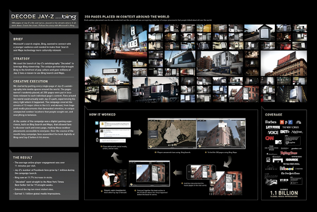 La agencia neoyorquina Droga5 fue la ganadora del Grand Prix de Cannes 2011, por el trabajo realizado para la marca Microsoft Bing en colaboración Jay-Z, El trabajo consistió en el lanzamiento de la autobiografía del cantante titulada "Decoded" las páginas del libro fueron ubicadas en miles de locaciones, usando carteleras, parabusses alrededor del mundo. Lo interesante de esto es que los fans del artista, entraron a Bing Maps para buscar todas las locaciones y "compaginar" el libro, eso fue el gran valor de la marca. Aquí el video.