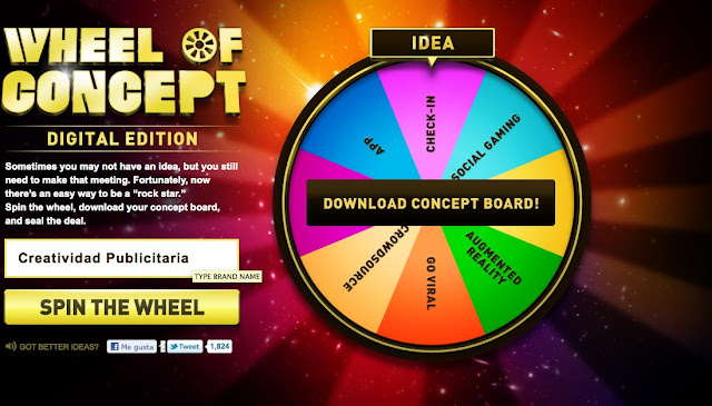 Brillante herramienta para mercadotecnistas, publicistas, ejecutivos de cuentas y todo aquel que trabaja en el fantástico mundo de las ideas para las marcas. Esto es "The Wheel of Concept" un maravilloso invento que te ayudará con el trabajo, sólo colocas el nombre de la marca, giras la rueda y te dará la gran idea lista para presentar al cliente. Ahorrése tiempo en las cansadas juntas de brainstorming, disfrute más paseos por el parque y no se preocupe si está en la fiesta y al día siguiente tiene que entregar la idea, aquí la solución desarrollada por la agencia: Tribal DDB.
