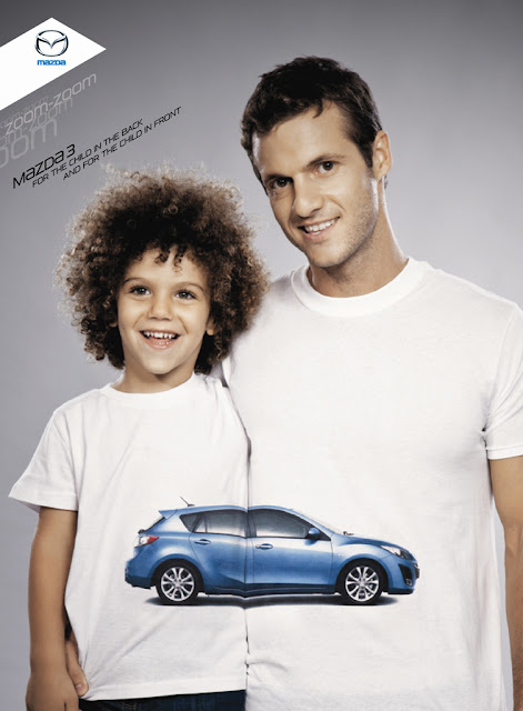 Una gráfica limpia, atractiva para vender el Mazda 3. No entendí literalmente el copy: "For the child in the back, and for the child in front", quiero suponer que se refiere al papá que actúa como niño. Disculpe usted.