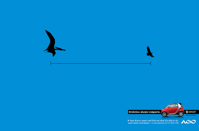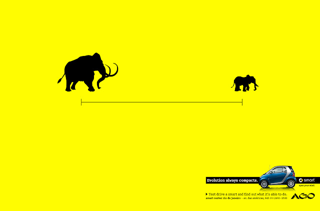 La agencia Conexão en Río de Janeiro diseña esta campaña gráfica para Smart, con el concepto "La evolución siempre compacta" una idea basada en la radical diferencia de un mamut con un elefante, o un brontosaurio con una jirafa.