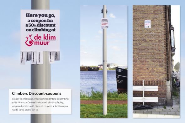 Ingeniosa publicidad exterior que se colocó en algunos lugares de Amsterdan para aprender a escalar, eran descuentos que estaban a una altura considerable, si los alcanzabas era porque tienes la vocación para hacerlo.
