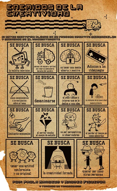 Paola Mandeur, Andrés Figueroa Y "Tenemos un Tamagochi" diseñaron este cartel infográfico llamados Enemigos de la Creatividad, 15 puntos que pueden apagar la chispa cretiva. Vale la pena tenerlo a la mano.
