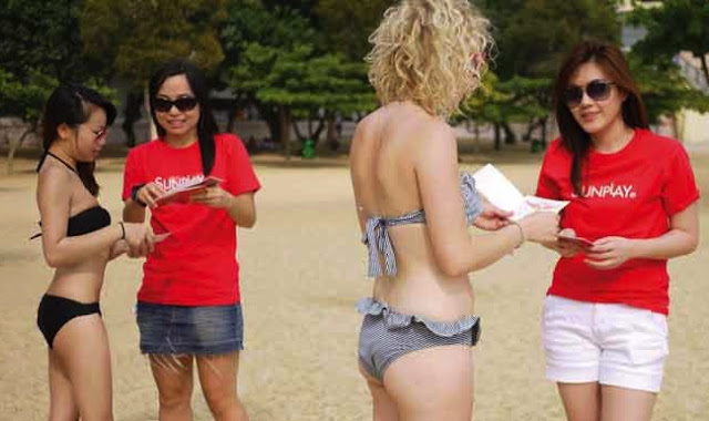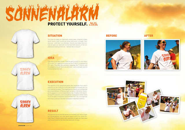 La idea fue regalar camisas completamente blancas, lo inusual es que a las camisas cuando se calentaban por el sol aparecía un letrero en el frente que decía Sonnen Alarm, acción que sorprendía a los portadores y en ese momento entraban los promotores de Sun Look para que se untaran el bronceador. Buena la idea.
