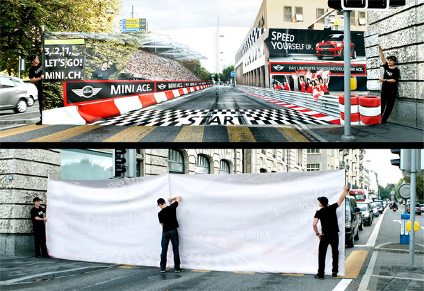 Este es otra forma de aprovechar las esperas del semáforo para dar un mensaje memorable. Este fue el modelo Ace de MINI, simulando con una manta las calles del Pole Position. la idea fue generada por la agencia DraftFCB / Lowe Group.