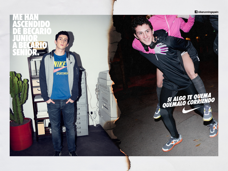 Uno de mis propósitos del año nuevo, pero del 2011, fue ir a correr, lo hice por varios días hasta que la rutina y el día a día consumieron nuevamente mis ganas hacia esta solitaria practica, por lo que no he encontrado motivos para iniciar de nuevo. Ahora que veo esta campaña de Nike Running con el slogan "Si algo te quema, quémalo corriendo" creado por la agencia Villar Rosas en España, tal vez me anime, no es porque me queme algo, pero cuando corres tu mente si libera. ¿O no? En fin, está buena la campañita :P
