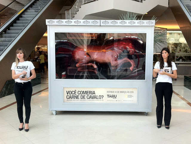 Esto se hizo en Brasil para promover la serie Tabu Brasil del canal Nat Geo, la agencia realizadora fue Loducca. Se puso un horno parecido con el que se hornean los pollos, pero pusieron un caballo (de plástico). Claro que llamó la atención, acá el video.