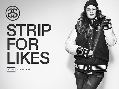 En Holanda la marca de ropa Stussy Amsterdam lanza una atrevida campaña publicitaria con una app en su página de Facebook, la idea fue poner a una modelo saturada en ropa pero con la promesa de que entre más likes tuviera la modelo se irá quitando cada prenda hasta quedar como vino al mundo.