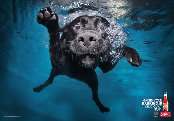 Aquí una gráfica que llama la atención en cualquier medio impreso o digital que se publique. Es para la salsa Cepera, donde toman como protagonista a perritos enchilados, curioso el hecho de mezclar comida para humanos con perros. Creativamente está bueno el ejercicio, así como la producción.