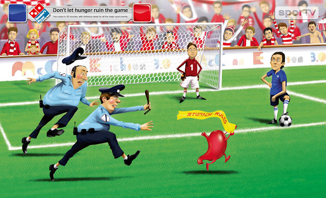 Me gustó la idea de este gráfico para Domino´s Pizza con el concepto: "No dejes que el hambre arruine el partido" Idea creada por la agencia McCann Erickson. Tengo mis dudas referente a si está bien ilustrado o hubiera sido mejor llevarla más allá con fotografía y un lindo render, puede ser.