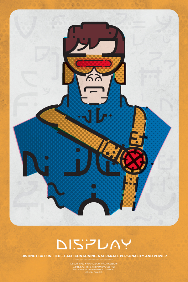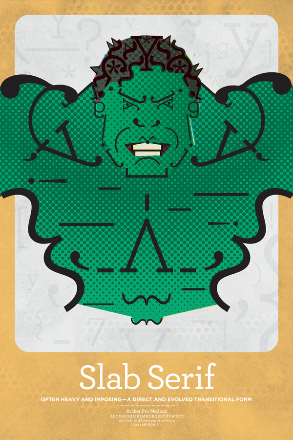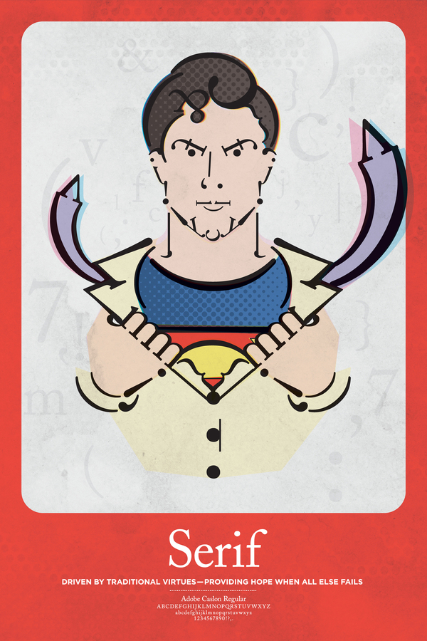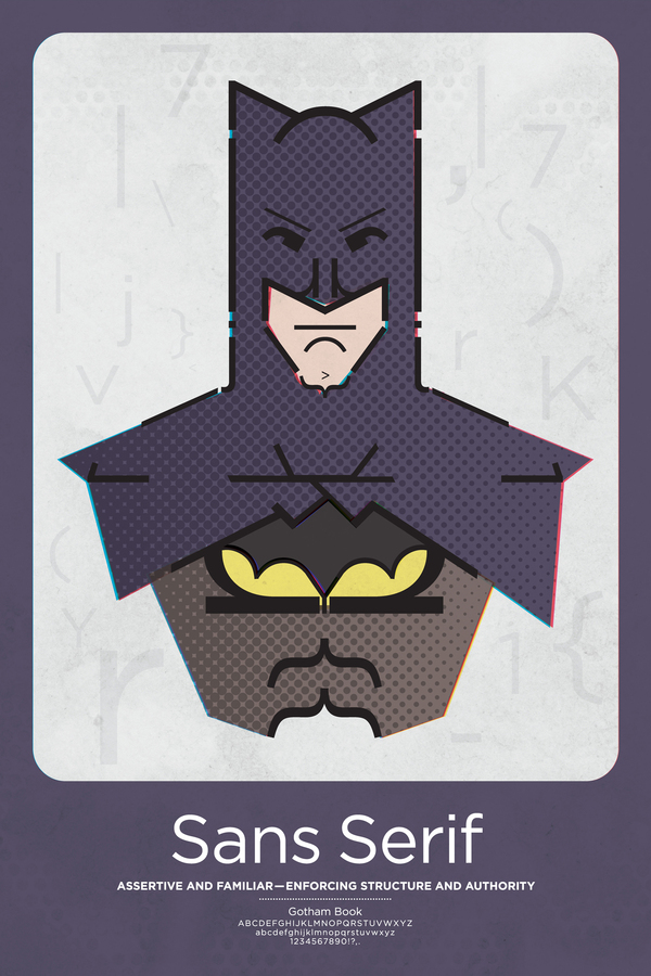 Tomando como eje tipografías el ilustrador Matthew Olin desarrollo este gran trabajo de ilustración.   Batman con Sans Serif, Superman Serif, Spiderman Script.