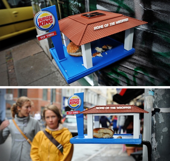 Este es un juguetito para demostrar que los pájaritos también les gusta Burger King, aunque al parecer no ha llegado ninguno a devorar el pan. Creo que el fotógrafo se hubiera esperado a tener una mayor asistencia.
