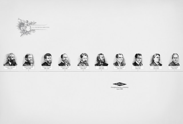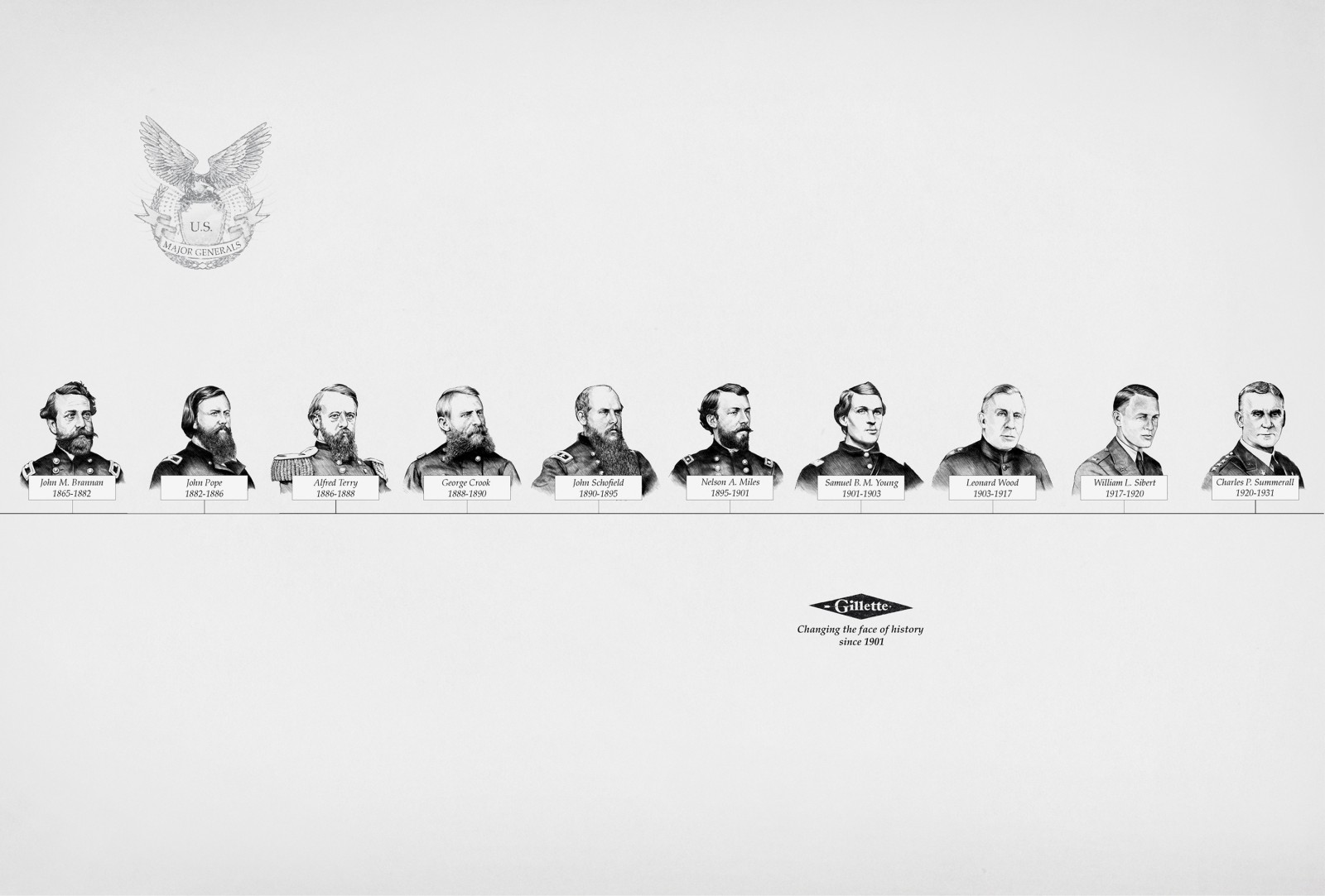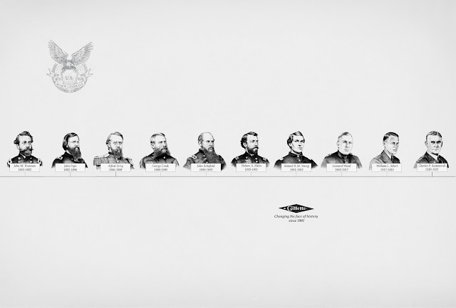 Muy atinada esta campaña gráfica para Gillette destacando el tiempo en que la marca lleva en el mercado. La gráfica muestra la línea de tiempo de embajadores, capitanes y directores de orquersta y "coincidentemente" los que ya no tienen barba están en el año 1901, el año en que entró la marca.