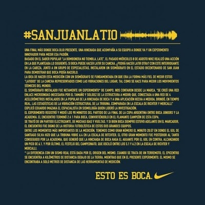 El equipo de Boca Juniors cuenta con una de las mayores hinchadas a nivel mundial, y para probar o conocer el poder que tiene este grupo masivo de personas, a Nike se le ocurrió colocar un sismográfo en el estadio del Bicentenario de San Juan, donde se jugaría la final de la Copa Argentina entre los xeinezes y el Racing Club.