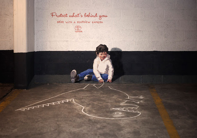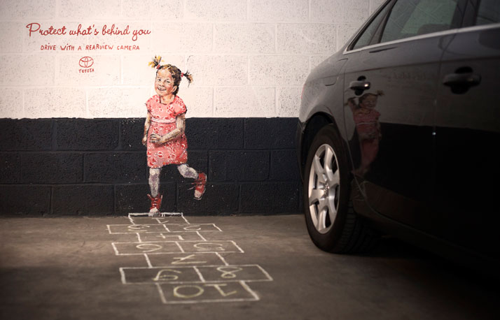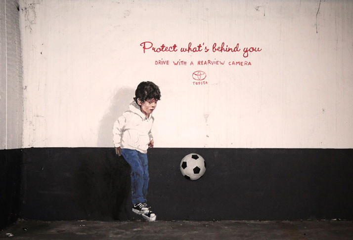 Con el fin de prevenir accidentes ocasionados por manejar de reversa, Toyota con el apoyo del artista callejero Ernest Zacharevic, lanzan esta campaña en estacionamientos, dibujando niños con aspecto real jugando, al lado un letrero que dice: "Protege lo que está detrás de ti. Maneja con la cámara de reversa"