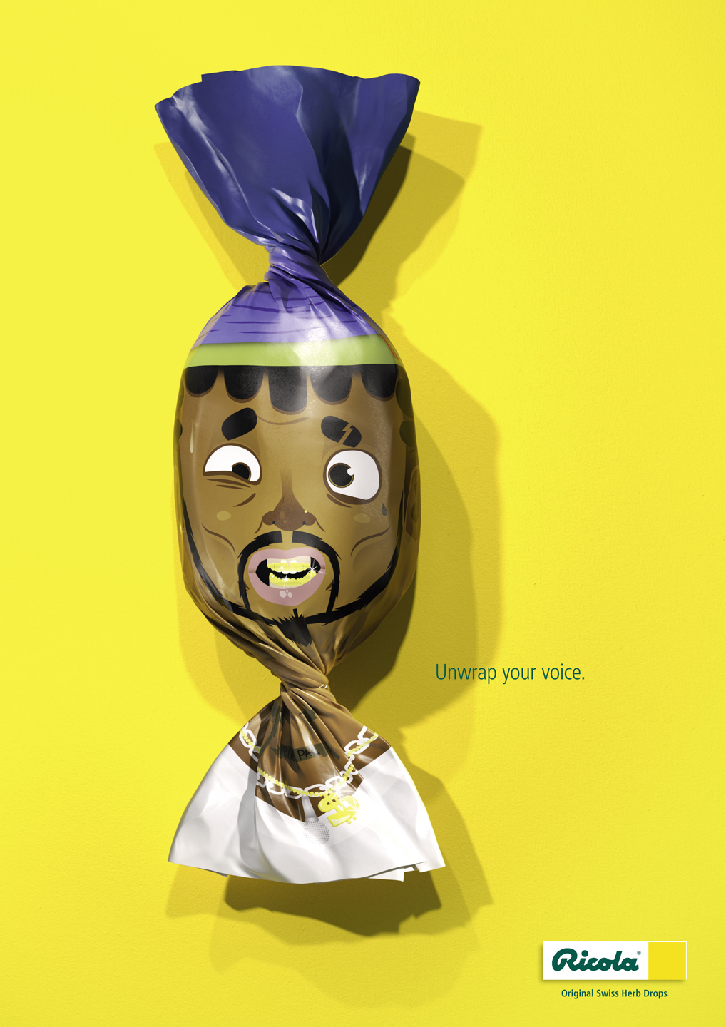 Divertida campaña gráfica creada por la agencia Jung von Matt para los dulces Ricola, en esta ocasión en su edición musical y con el acertado concepto: "Unwrap your voice" que se acopla muy bien a las características de estos dulces.
