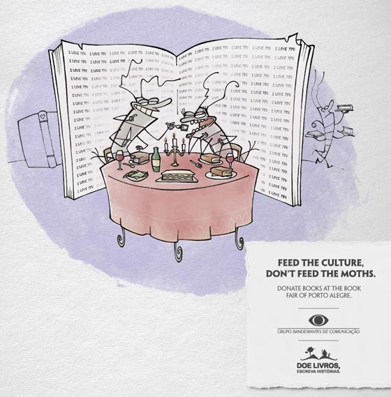 Divertida campaña publicitaria para promover la donación de libros. Ilustraciones sencillas, texto...