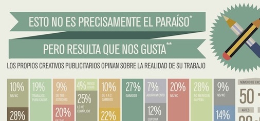 Esta es la cruda realidad de la publicidad, un infográfico dictado por varios creativos publicitarios de 30 agencias de publicidad con un promedio de 9 años de experiencia, algunas de las preguntas fueron: ¿estás orgulloso del resultado final de tus trabajos?, ¿cuántas de tus ideas han visto la luz y cuántas cayeron por el camino? ¿qué porcentaje de días has cumplido tu horario?.