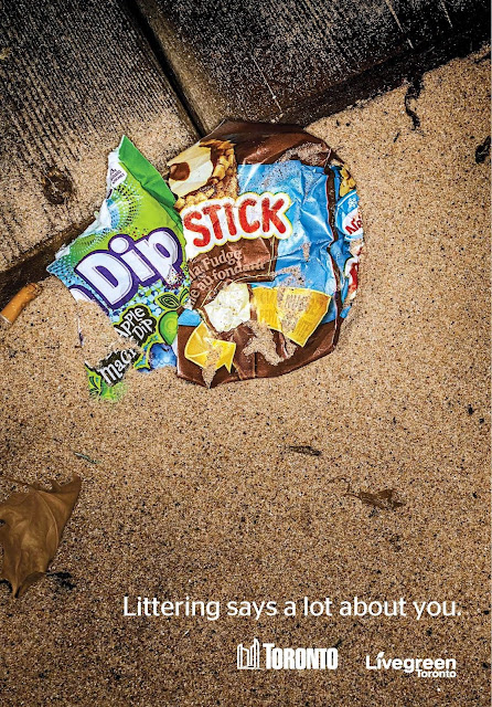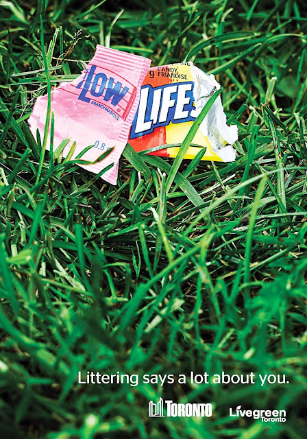 En muchos lugares todavía está la desagradable costumbre de tirar la basura en el suelo, esperando que sola corra al cesto de basura o que algún gnomo la recoja y la lleve a su mundo de fantasía donde construyen casa con la basura. Y para este tipo de personas que les podemos llamar de muchas formas, la marca LiveGreen en Toronto crea esta bonita campaña gráfica en el que utiliza los desechos para enviarles un bonito mensaje.