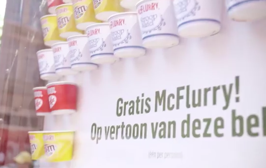 En Amsterdam, coloco una especie de muppie sensible a la temperatura, que incluía 100 vasos para canjear por un McFlurry en el McDonald's más cercano. Para tomar estos vasos la gente tuvo que esperar a que el termómetro marcará los 38.7 grados, llegó el momento, todos se apalancaron y disfrutaron de nieve gratis. Agradezcan el McFlurry gratis a la agencia JCDecaux.