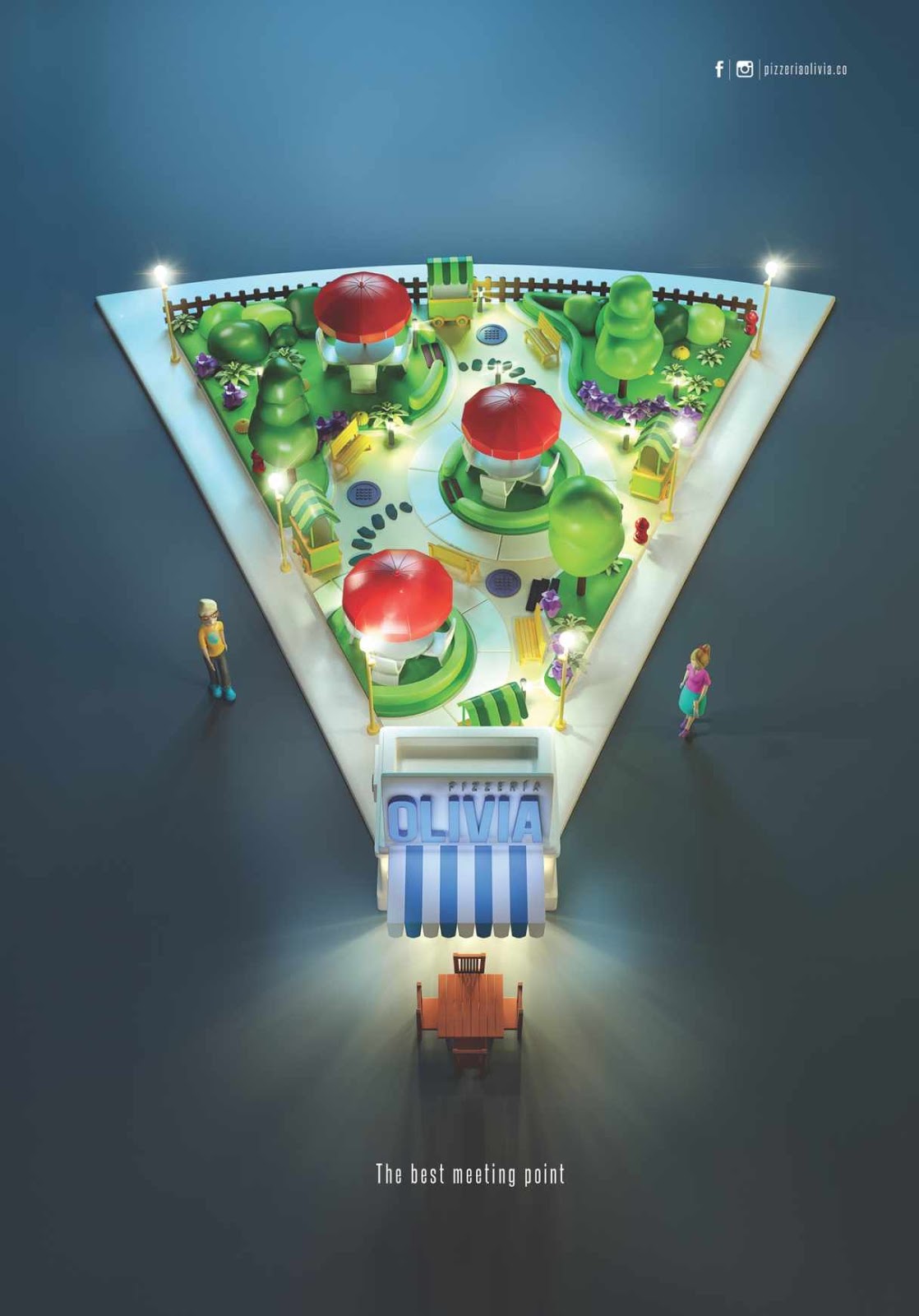 Soy fan de esta campaña gráfica, creada para la pizzería Olivia en Colombia. Un trabajo gráfico muy bien realizado, una idea redonda, en este caso triangular, que nos muestra el valor de este lugar, en una rebanada.