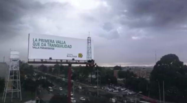 En Colombia, hay un gran problema, como en muchos lados, supongo. El problema al que se enfrentan es a las tormentas, siendo más específico a los rayos, que lamentablemente se ha llevado la vida de muchas personas. Para reducir el número de percances por tormentas eléctricas, a la agencia Leo Burnett se le ocurrió desarrollar para su cliente Seguros Bolivar, la valla de la tranquilidad, un bonito billboard con pararrayos integrado, que da mucho valor a la marca que lo patrocina.