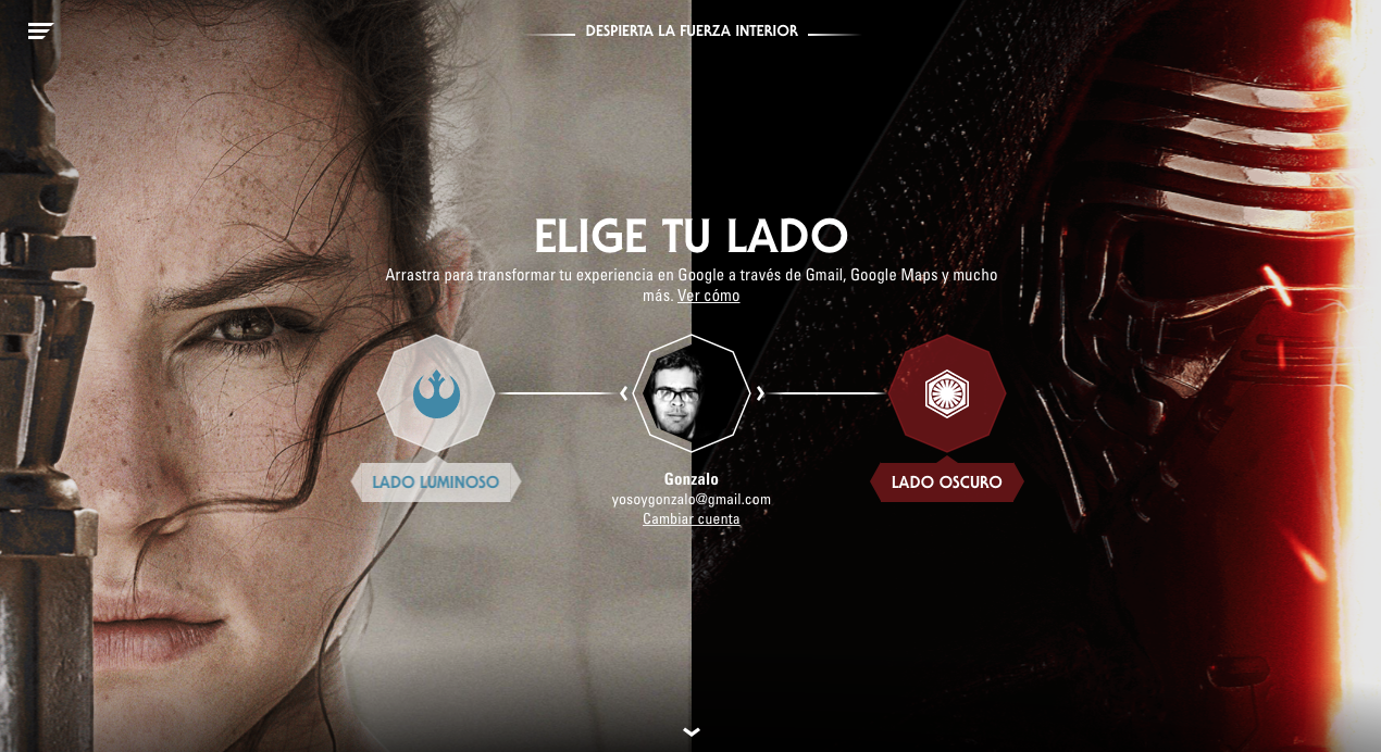 Muchas marcas se han agarrado del boom de Star Wars y Google no ha sido la excepción, han creado una experiencia digital en la que te preguntan ¿De qué lado estás? del lado oscuro o del lado luminoso. Yo escogí estar del lado de los buenos, aunque la tendencia indica que hay más quien eligió estar del lado oscuro.