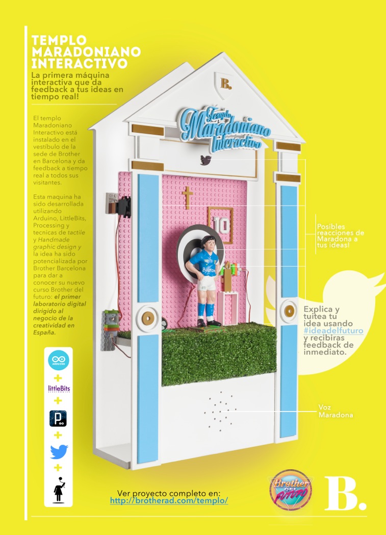 La peculiaridad de este artilugio es que se muestra al mundo como un pequeño homenaje en forma de Templo Maradoniano plagado de tecnología en sus entrañas, pero con detalles artesanos como una figura de barro cocido del 10 traída nada más y nada menos que desde la ciudad de Nápoles. Este Templo Maradoniano tiene la peculiaridad de ser interactivo: teniendo en cuenta la honestidad brutal y los pocos pelos en la lengua de su protagonista, la máquina ofrece feedbacks tajantes, intensos y contundentes. Una idea publicada en Twitter con el hashtag #ideadelfuturo es todo lo que se necesita para recibir feedback de la mismísima estatua del Diego, que cuenta con una gran variedad de respuestas directas y reacciones que se pueden ver en una web creada para la campaña (brotherad.com/templo) que muestra la instalación en Brother Barcelona, en la que muchos alumnos deciden vivir la experiencia cara a cara. Con este homenaje, la escuela pretende mostrar que tipo de ideas pueden llegar a hacer sus alumnos en el nuevo curso de creatividad e innovación que comienza el próximo 19 de febrero y se extenderá hasta finales del mes de mayo: Brother Del Futuro o Brother delfu, como le decimos nosotros.