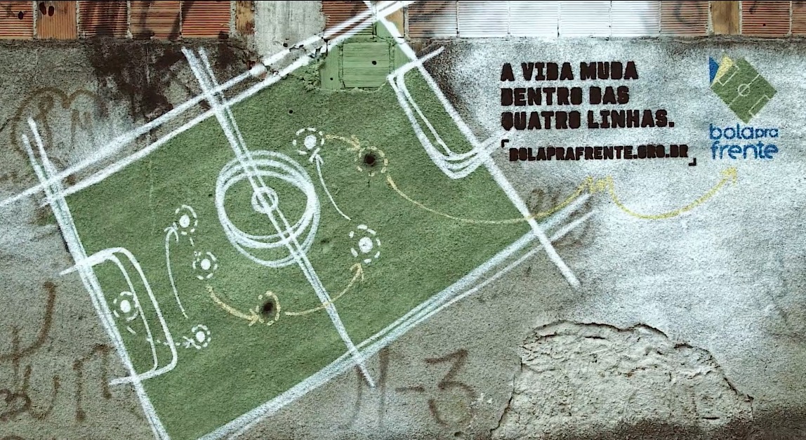 Los agujeros de bala, esparcidos en las paredes de la Favela do Muquiço, muestran que la violencia está siempre a la vuelta de la esquina. Es donde entra la agencia brasileña: Agência3 quien transformó estas marcas de violencia en vallas publicitarias que favorecen el trabajo de la ONG con el copy: "La vida cambia dentro de las cuatro líneas".