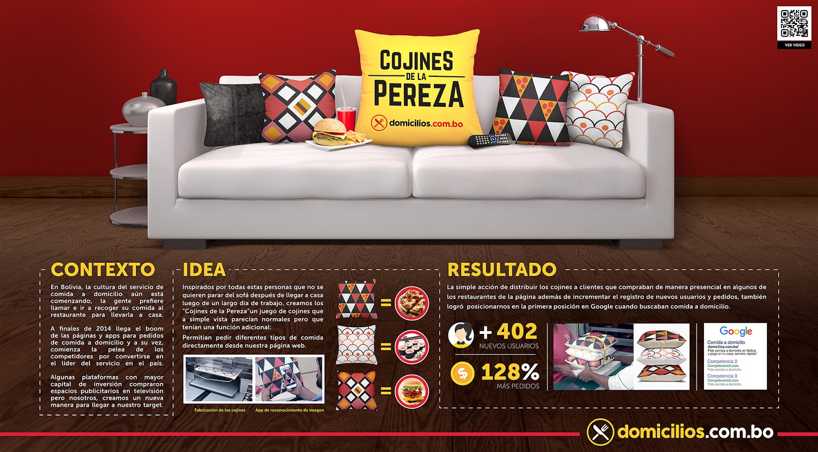 Para lograrlo, dejaron a un lado los medios tradicionales y prefirieron brindar comodidad a sus futuros clientes, con unos bonitos cojines llamados "los cojines de la pereza" que además de decorar tu sala o tu alcoba, tienen una imagen que al ser escaneada con tu móvil entrabas directamente a su página para hacer el pedido, así no te tienes que levantar por el teléfono, solo a abrirle al repartidor.