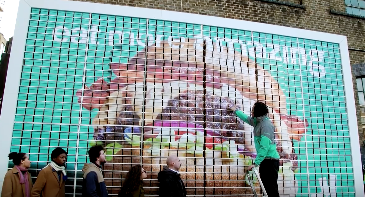 Deliveroo es una compañía británica de entrega rápida de comida, con operaciones en Reino Unido, Países Bajos, Francia, Alemania, Bélgica, Irlanda, España, Italia, Australia, Singapur, Dubai, y Hong Kong. Y en Londres, con el título "Eat more amazing" tuvieron la sensacional idea de crear una valla comestible, no literalmente, este anuncio se creó con 2000 hamburguesas, cada una guardada en su cajita, lo que formaba la valla.