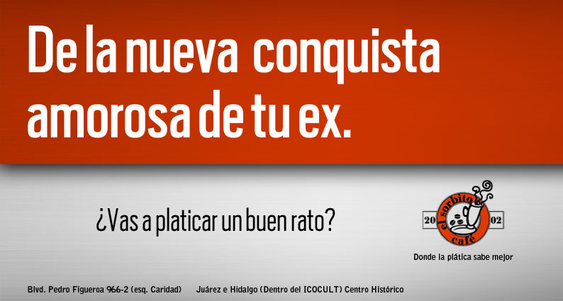 Si quieres vender tienes que sobresalir, no importa el lugar donde te encuentres, lo que vendas y a quien te dirijas, la buena publicidad siempre es bien recibida, se agradece el empeño que se pone a un anuncio. Y por mucho tiempo he seguido lo que se ha hecho para Café El Sorbito y su "Venenito" por parte de la agencia que le ha metido cariño a esta marca y a otras más. ¿ Cómo las ves ?