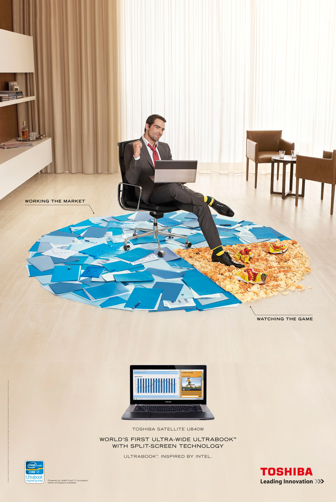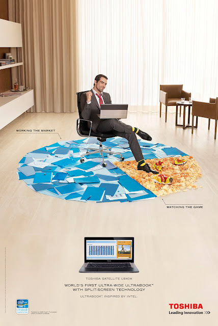 Para promover las nuevas laptop Toshiba con pantalla más ancha, la agencia Clemente BBDO en Australia diseña esta campaña en donde muestra a diferentes targets realizando sus tareas diarias, lo interesante del diseño es la gráfica de pastel por la que están sentados, mostrando en ellas el porcentaje de tiempo para cada tarea.